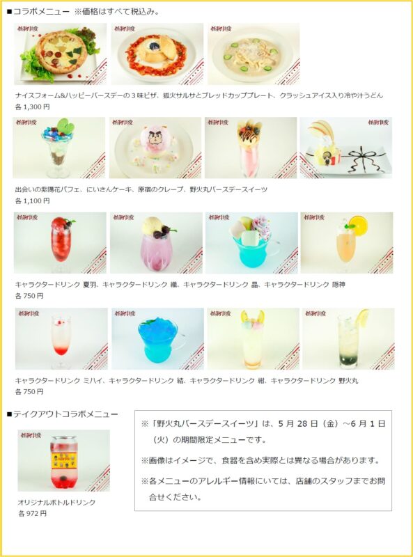 「ナイスフォーム&ハッピーバースデーの3味ピザ」や「狐火サルサとブレッドカッププレート」、「出会いの紫陽花パフェ」などTVアニメのストーリーより考案したメニューが登場。